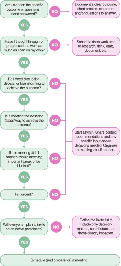 We need to stop treating ‘work’ and ‘meetings’ as synonyms and take back control. Start with a mindset shift: Meetings are a last resort, not the default. Use this quick decision flow before booking your next one.