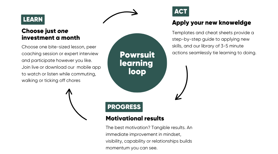 Women are time-poor, so Powrsuit focuses on what works. Grounded in behavioural science and real career challenges, our professional development platform is built on a simple philosophy: Small actions beat grand intentions.