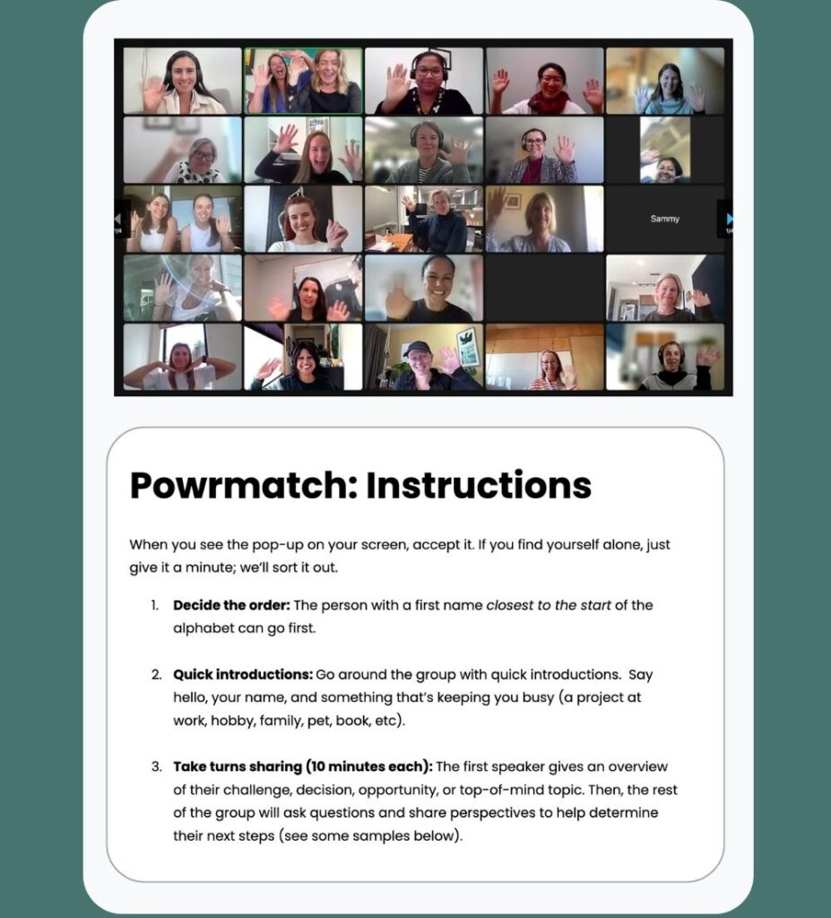 Want the benefits of coaching, without the price tag? Monthly Powrmatch connects you with small groups to help solve your career challenges. Hone your skills while receiving fresh perspectives and pragmatic support.