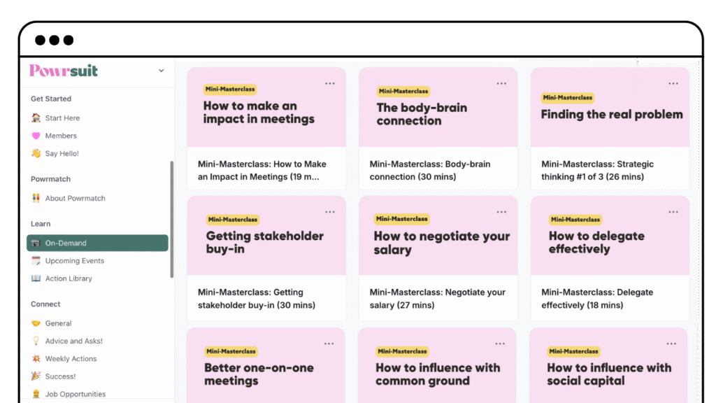 While everyone joins the same platform, new Powrsuiters join through fortnightly intakes. When you become a member, you’ll be invited to a welcome call to meet other new members, ask questions and learn how to maximise the impact of your professional development. From there, you have full access to all live events, on-demand learning and micro-networking with all other members.