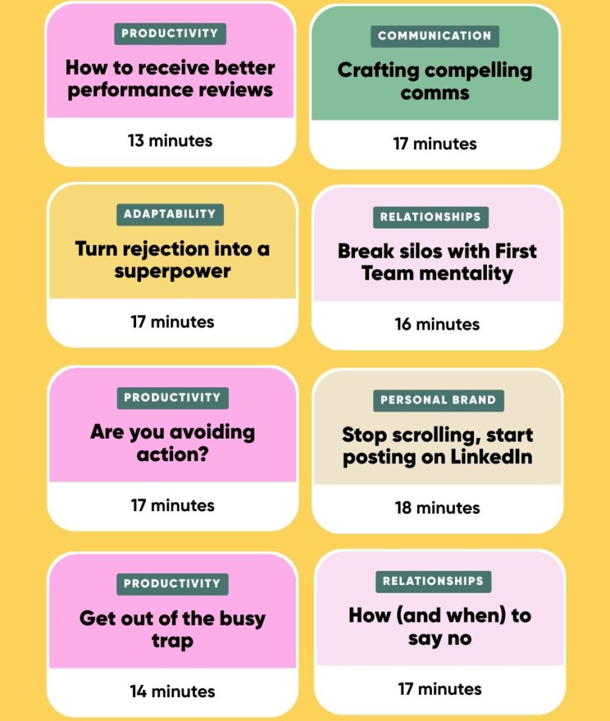 Can’t make it live? Our on-demand library puts you in control of your professional development. Choose what you need, when you need it – like asking for feedback, addressing a conflict, building your personal brand, tackling a self-limiting belief, or adopting a smarter prioritisation framework. Our mobile app makes it easy to watch or listen while commuting, exercising or ticking off chores.